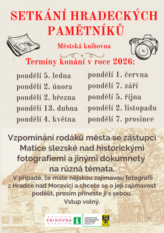 pondělí 5.1.202609.00 Městská knihovna Hradec nad Moravicí: Setkání hradeckých pamětníků a beseda s Jindřichem Skařupou