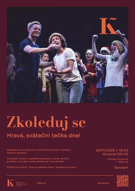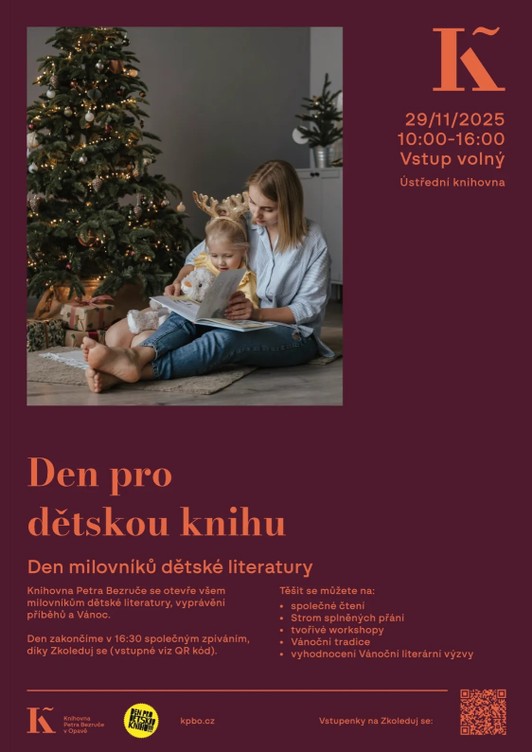 Knihovna Petra Bezruče v Opavě se otevře všem milovníkům dětské literatury, vyprávění, příběhů a Vánoc. Těšit se můžete na společné čtení, Strom splněných přání, tvořivé workshopy, Vánoční tradice nebo vyhodnocení Vánoční literární výzvy … Den pro dětskou knihu zakončíme v 16.30 hodin společným zpíváním díky Zkoleduj se (adventní charitativní koncert).