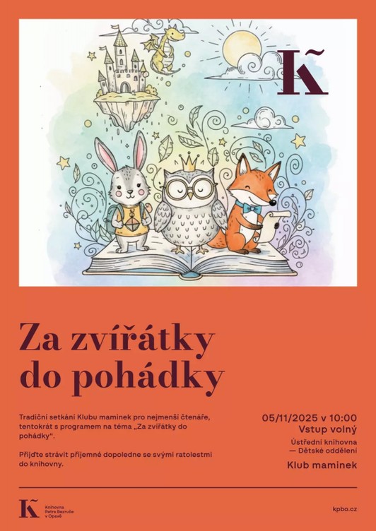 Tradiční setkání Klubu maminek pro nejmenší čtenáře, tentokrát s programem na téma Za zvířátky do pohádky. Vstup zdarma.