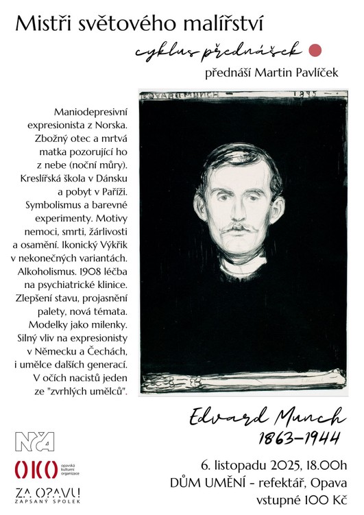 Maniodepresivní expresionista z Norska - Edvard Munch. Zbožný otec a mrtvá matka pozorující ho z nebe (noční můry). Kreslířská škola v Dánsku a pobyt v Paříži. Symbolismus a barevné experimenty. Motivy nemoci, smrti, žárlivosti a osamění. Ikonický Výkřik v nekonečných variantách. Alkoholismus. 1908 léčba na psychiatrické klinice. Zlepšení stavu, projasnění palety, nová témata. Modelky aka milenky. Silný vliv na expresionisty v Německu a Čechách, i umělce dalších generací. V očích nacistů jeden ze „zvrhlých umělců“.