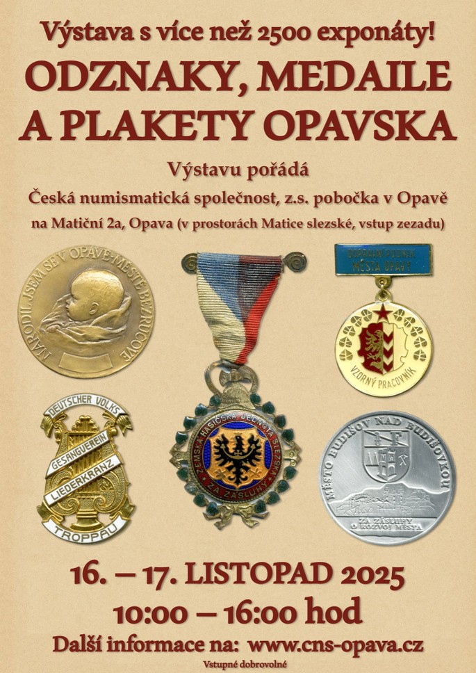 10.00 Česká numismatická spol. Opava / Matice slezská: Odznaky, medaile a plakety Opavska (výstava do 16.00 h.)