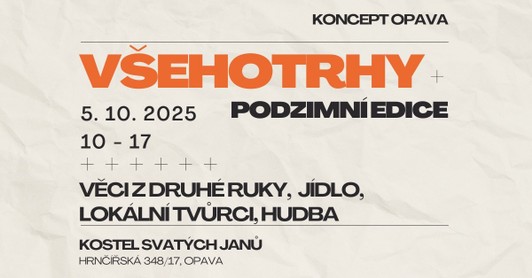 Než přijde čas adventního design marketu, zveme vás na podzimní VŠEHOTRHY! Přijďte si užít komunitní atmosféru, objevit second hand poklady, tvorbu začínajících tvůrců anebo si udělat jen hezkou neděli.