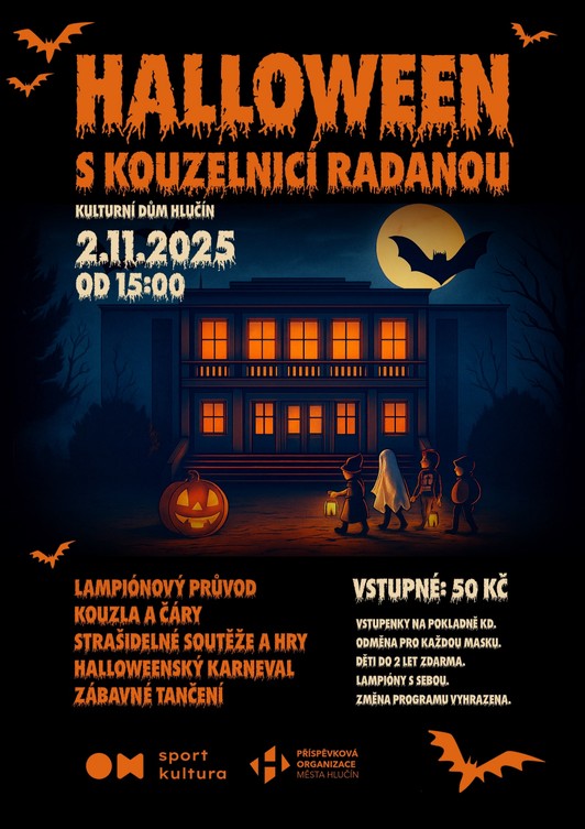 Přijďte si užít kouzelné odpoledne plné zábavy, fantazie a tajemné halloweenské atmosféry. Kouzelnice Radana přivítá malé i velké návštěvníky svým poutavým programem, který nabídne pestrou směs kouzel, čar a zábavných aktivit. Děti se mohou těšit na strašidelné soutěže a hry, halloweenský karneval plný masek a kostýmů, a také samozřejmě na lampionový průvod, který rozzáří podvečerní Hlučín. Chybět nebude ani taneční zábava, která pobaví nejen nejmenší, ale také jejich rodiče.
