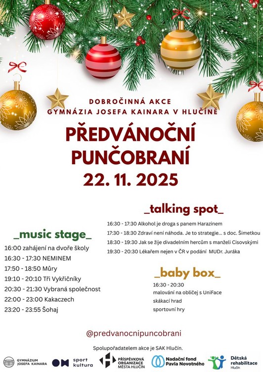 Studenti a učitelé hlučínského gymnázia zvou veřejnost na již 5. ročník dobročinné akce Předvánoční punčobraní, která se uskuteční v sobotu 22. listopadu 2025 v prostorách školy. V letošním roce si pro návštěvníky připravili hudební stage plnou zajímavých kapel, talking spot v podobě besed s významnými osobnostmi a také dětský koutek v prostorách tělocvičny pro nejmenší návštěvníky.