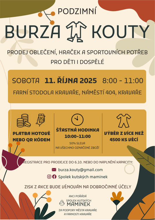 Spolek kutských maminek pořádá pro děti a dospělé jarní burzu oblečení, hraček a také sportovních potřeb. Nutná registrace k prodeji do 6.10.2025. Zisk z akce bude věnován na dobročinné účely.