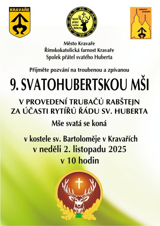 Město Kravaře, farnost Kravaře a Spolek přátel svatého Huberta Vás srdečně zvou na již 9. Svatohubertskou mši.