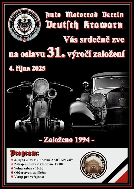 Auto Moto Club Kravaře - Auto Motorrad Verein Dt. Krawarn vás srdečně zve na oslavu 31. výročí svého založení.