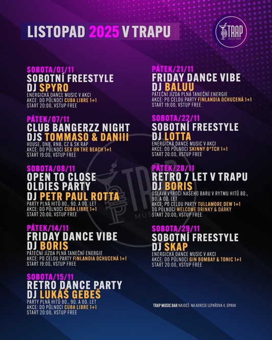 www.facebook.com/trapopavae-mail: trapopava@gmail.comotevřeno: po, út, čt, ne zavřeno, st 19.00 - 01.00, pá 19.00 - 04.00, so 20.00 - 04.00 hod.