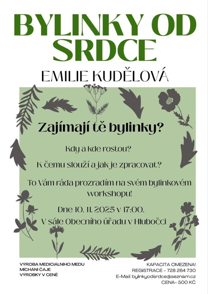 17.00 Sál Obecního úřadu Hlubočec: Emilie Kudělová - Bylinky od srdce (workshop)