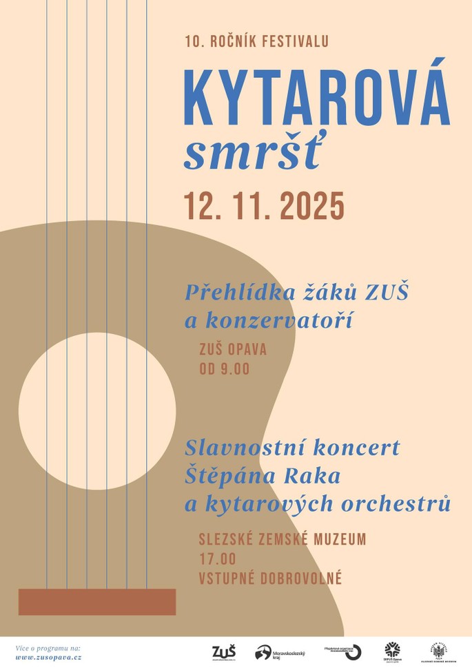 středa 12.11.202509.00 ZUŠ Opava / koncertní sál Nádražní okruh: Kytarová smršť - přehlídka žáků ZUŠ a konzervatoří