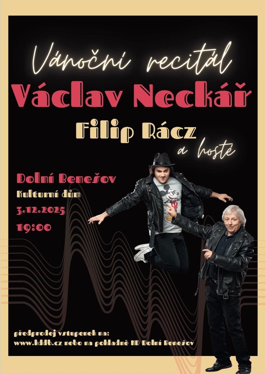 Přijďte si užít jedinečný vánoční recitál legendárního zpěváka Václava Neckáře a také talentovaného ostravského zpěváka Filipa Rácze. Koncert vás provede celou Neckářovou bohatou kariérou, od jeho začátků v divadle Rokoko až po comebackový hit Půlnoční. Kromě největších hitů uslyšíte i vzácné perličky z jeho tvorby. Speciálně pro tento benešovský koncert připravil Filip pro Václava řadu hudebních překvapení a pozval též hosty spojené s Dolním Benešovem a okolím. Tento recitál je jediný svého druhu, nenechte si ujít nezapomenutelný předvánoční zážitek.