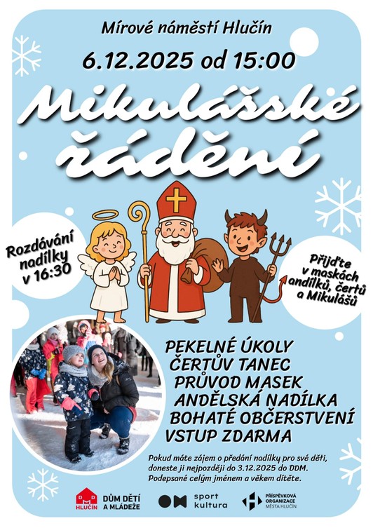 16.30 hod. - Mikulášská nadílka - přijde Mikuláš a rozdá dětem dárečky (dárečky se jménem, příjmením a věkem dítěte je nutné předat předem v DDM do 3. prosince 2025)